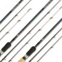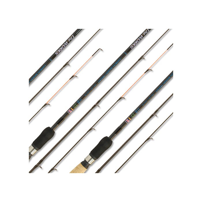 This two piece fold down feeder rod is ideal for bomb or compact method feeders on commercial carp pools. It has a soft progressive action, with screw down loc-tite reel seat, lined guides and a cork/EVA handle, that is ideal for landing carp quickly. You get the option of two quivers and it has a 10lb main line with an 6lb hook length rating. Carbon composite with a satin black ground finish.