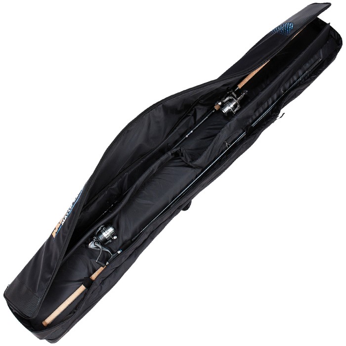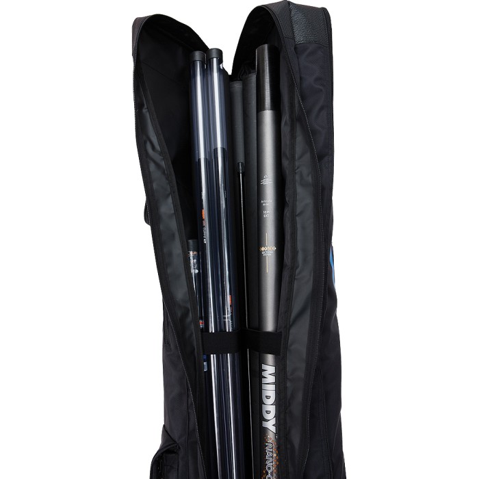 The Xtreme Mega Holdall will hold all you could need when setting off for a serious top-line match. It has been particularly designed for commercial venues where you need your 16m pole, many top-kits and a feeder and waggler rod setup to cover whichever tactics might be required on the day, with its 1.89m length accommodating all of this. It has a unique, fully-padded, almost-hidden compartment that safely holds and protects two rods complete with reels attached, yet it remains virtually the same size as Middy's previous eight-tube match holdall.