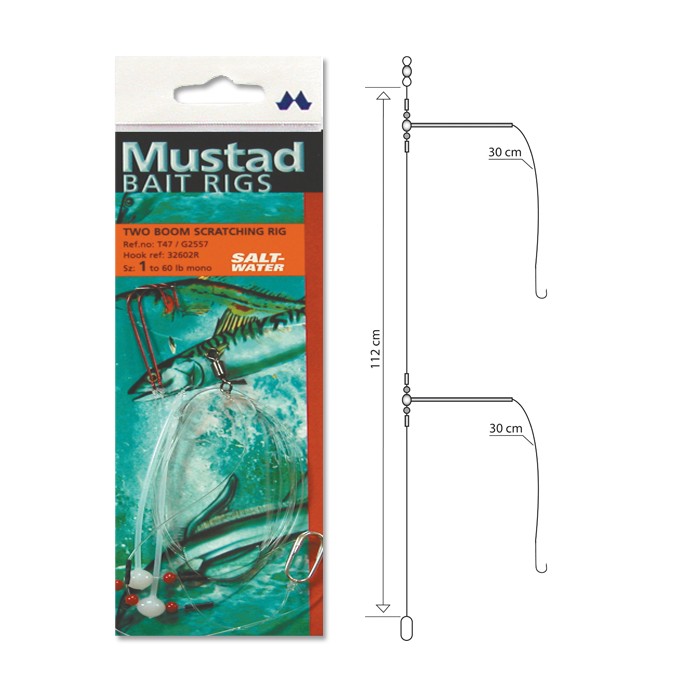 Mustad 2 Boom Scratching Rig - A top rig during early spring and when bites are scarce, White booms act as an attractor &also makes bait behave erratically, adding movement as the tidal surge lifts it, Best used close to medium range with a 5 to 6oz release wire lead.
