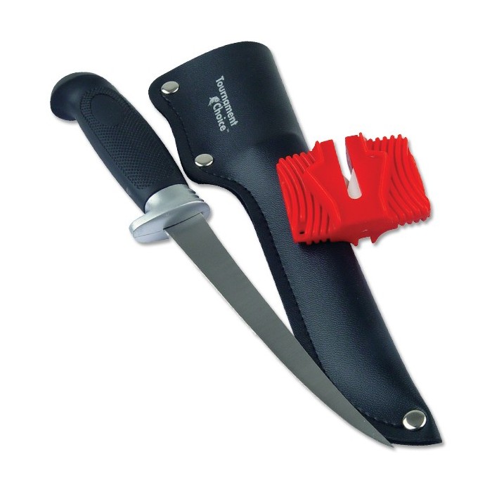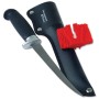 This is a high quality filleting knife as you would expect from Mustad. This one has a 7 inch blade for making neat cuts through tough flesh. The non-slip handle enables you to keep a steady line as you draw the blade down the backbone of a fish. There is also a built in finger guard and it comes complete with an effective knife sharpener.
