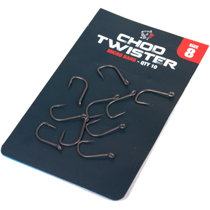 Nash Chod Twister Hook, Designed for chod rigs and jointed stiff pop-up presentations, the Fang Twister Chod uses the same proven wide gape, angled profile for fast turning and the most aggressive hooking. The Twister Chod's unique shape brings the same fast turning hooking performance to chod rigs as the best selling Twister has to bottom bait presentations. Fang Twister Chods sit perfectly under D loop mounted pop-ups, spinning instantly when carp lift the hookbait or touch the curved link. The slightly enlarged out turned eye allows easy whipping of high diameter link materials like Chod Link, heavy mono or fluorocarbon. Like all Fang patterns the high carbon Japanese steel of the Twister Chod offers up to 20 per cent greater strength for the same wire gauge, combined with the renowned sticky sharp Fang points. Available in sizes 5, 6, 7 and 8 in both Micro Barbed and Barbless. Ten per packet.