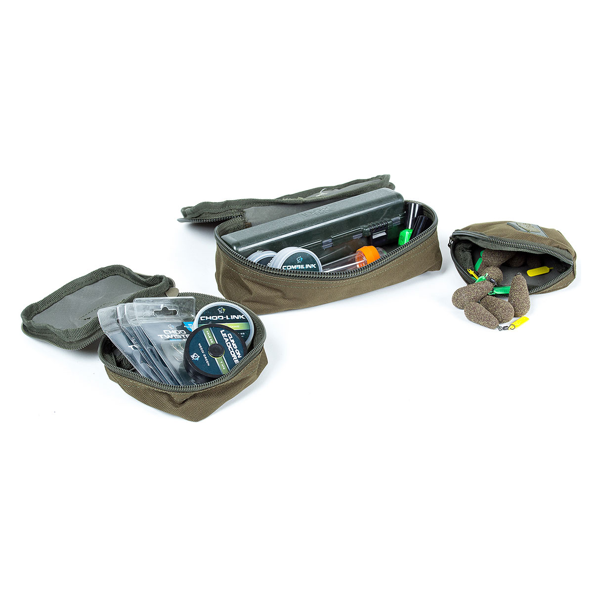 Three pouches in one, the H-Gun Pouches Set holds all your terminal tackle and small items. Single solution storage for all accessories and terminal tackle items. Tough zipped pouches that protect and organise almost any of your smaller essentials. Both smaller pouches neatly fit inside the largest pouch.