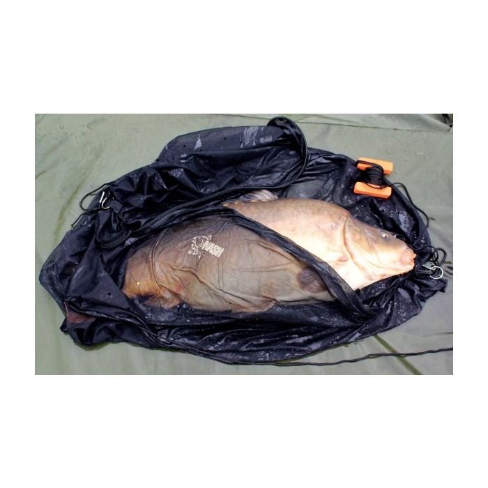 Note: Kevin Nash developed this system after experiences in France where muskrats were chewing through the retaining cords on carp sacks. To avoid this happening with the sickening result of a lost carp entombed in a sack, Nash recommend that you always use the Monster Carp Zip Sack (Safety System).