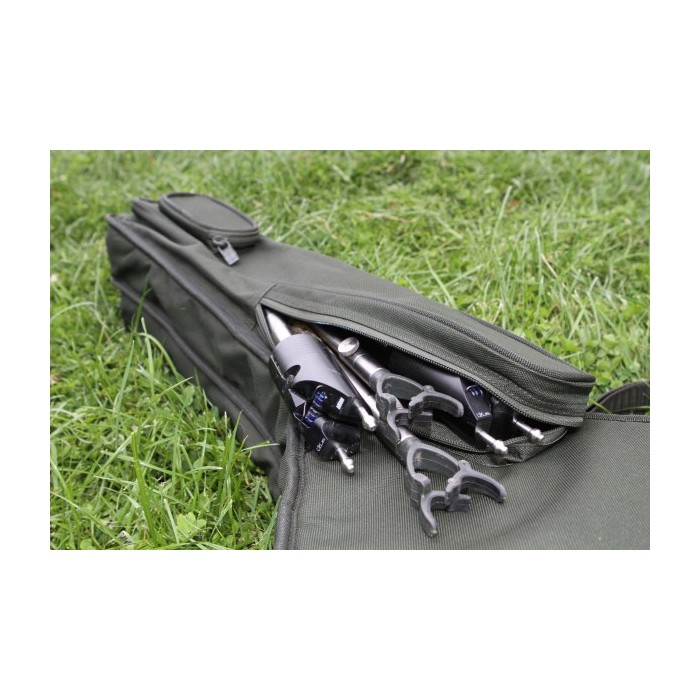 - Two fully zipped cushioned pockets to accommodate two tackled up 12' rods with big pit reels attached.