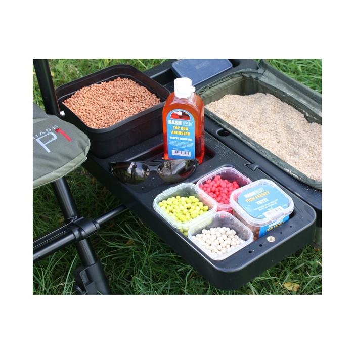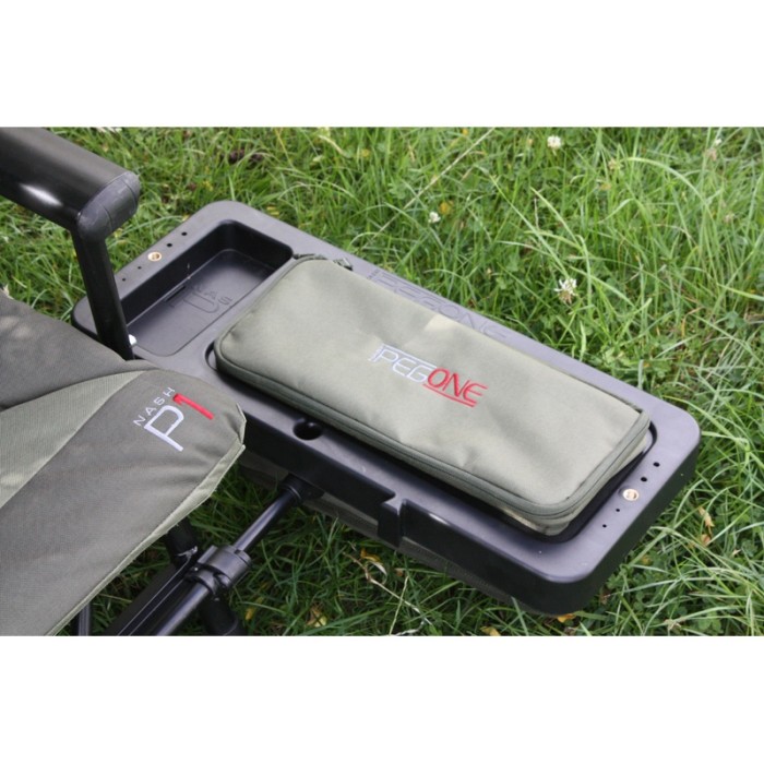 Nash PegOne Double Bait Tray has been designed to connect directly with all of the Transformer Chair Range via the simple to use accessory arm. Nash PegOne Double Bait Tray keeps essential tackle and bait neatly laid out and close to hand in the perfect position when fishing from the chair. Nash has even incorporated holders for baiting needles at the front so that these small but essential items are always close to hand.