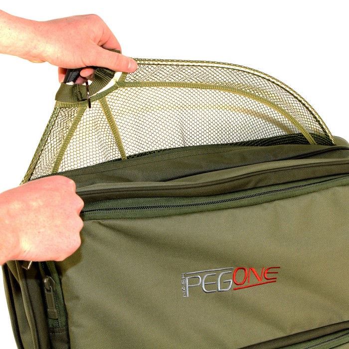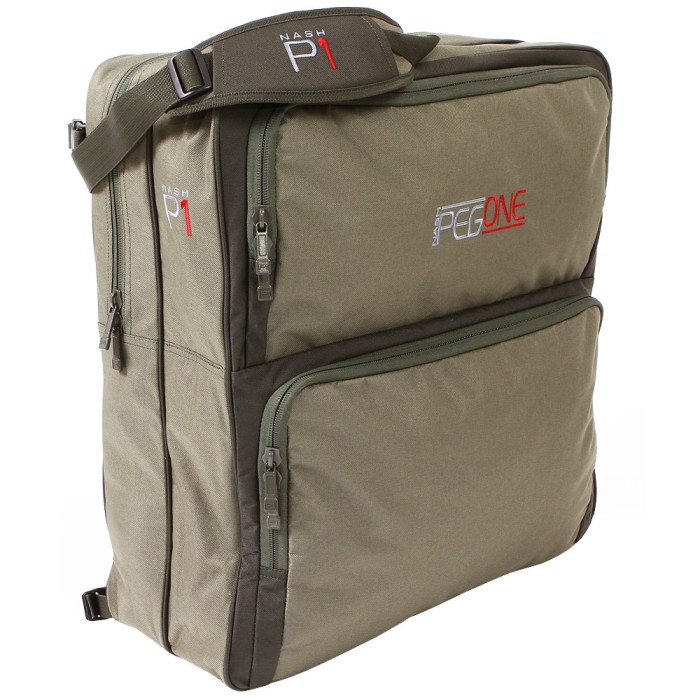 Nash Peg One Transformer Net Carryall, The comfortable zip-away carry strap allows the Transformer Net Carryall to be used on its own, but it is when it is combined with a Transformer Chair and Trolley Kit that this bag really comes in to its own. Simply attaching to the chair using four clips, the bag can be left in place permanently for massive extra storage capacity. And because the bag sits over the wheels it balances perfectly, minimising the strain of carrying your kit even over long distances. Large enough to carry two keepnets and large pan landing nets in a heavy-duty zipped compartment with an additional two separate sections designed to carry pole roosts, bait tables, bait tubs, and a whole host of other essential tackle items.