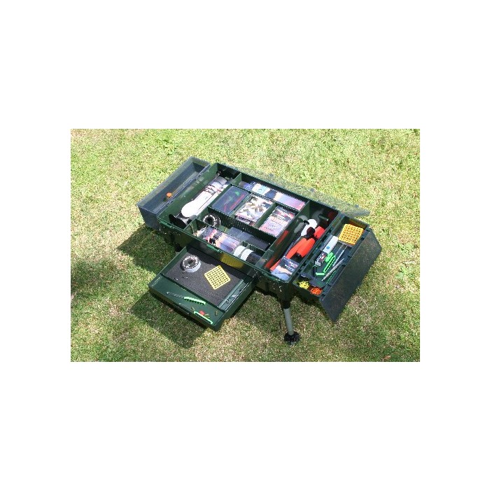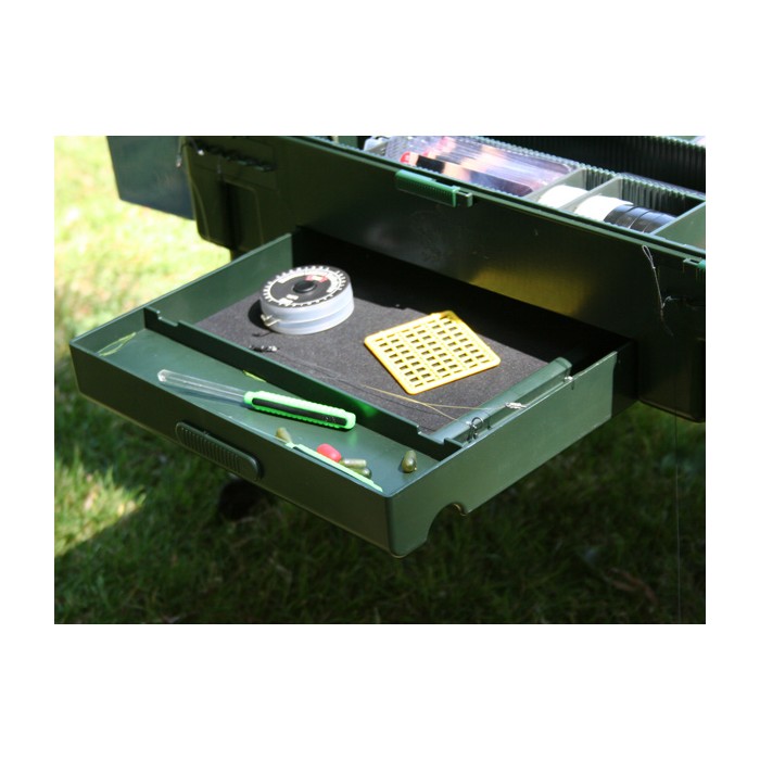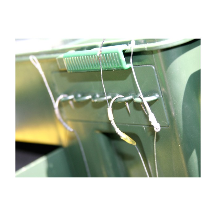 The deep lip worktop reduces the risk of any spillages and has metric and imperial calibration to ensure that each of your rigs is constructed as accurately as you demand. Storage loops along the side of the box allow you to store ready-baited rigs so you are ready to go as soon as the situation demands and a slide out rig board gives you exceptional workspace for crafting your rigs. The height adjustable legs with swivel feet not only ensure that your storage system remains completely stable, no matter the terrain, but they also fold flat for easy storage off the bank.