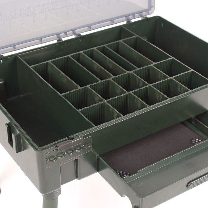tackle boxes, but also boasts the additional ability to store larger items, such as spod rockets, markers, and PVA loading tubes, with ease. Variable partitioning enables you to customise this rig station to perfectly complement your own needs.