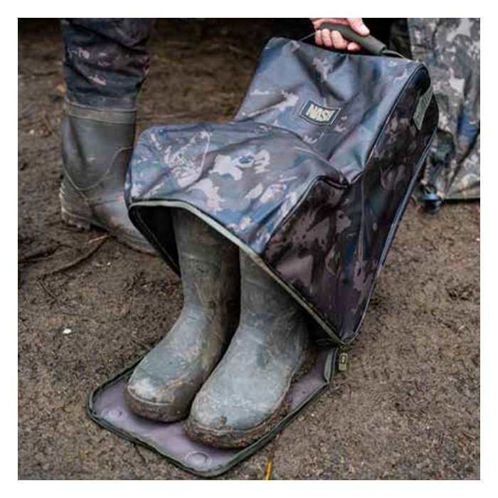 Nash Subterfuge Waterproof Wader & Boot Bag, ideal for transporting your wet, muddy waders and wellies in your vehicle without creating a mess. Also ideal for keeping them dry overnight when left outside a bivvy. Simply lift the top carry handle to slip your waders or boots on.