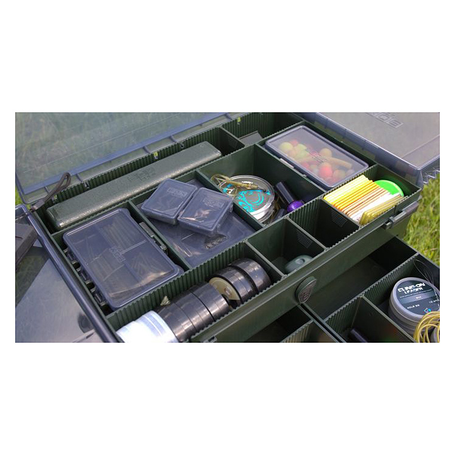 With plenty of variable, easily-customised space, this tackle station is the perfect way to store all your rigs and accessories neatly in your bivvy, and is the height of convenience for anglers who are spending several days in a row at the bank. Four large and eight small dividers create customised storage, giving you the flexibility to store your tackle your way, and making it easy to find just what you need when you’re out on the bank, while removable drawers can either sit on the underside of the table, keeping those accessories you don’t need immediately neatly out of the way, or can be brought up to sit inside the lid – perfect for working on your rigs while you’re waiting for your swim to kick off. Convenient dovetails at either end give you the option of attaching Tackle Station Side Tables, which are sold separately, and allow you to extend your working area, while a deep, anti-spill lid forms the perfect work surface.