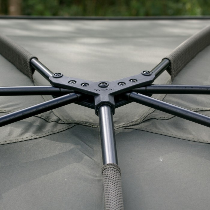 The first improved feature that you’ll notice on the T1 and T2 Titans is the glass filled nylon block. This is an ultra-light and ultra-strong block design which drastically reduces the overall weight of the bivvy whilst retaining maximum strength. It also enhances the rigidity of the bivvy and the Titan system is completely devoid of tensioning bars or straps. On bank set up is super speedy, as you don’t have to circle the bivvy tightening and retightening straps in order to ensure that it can cope in all weather conditions. Instead, you simply fan the bivvy out from the central block and peg it down with its supplied T-pegs. This ensures that you can maximise the amount of time you spend on the bank fishing, minimising the amount of time wasted on the bank setting up your tackle.