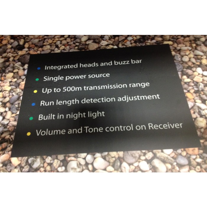 This revolutionary device comprises three integrated micro alarm heads and sensitivity selector buttons but uses one power source, a single radio transmitter all of which is contained in one buzz bar system.