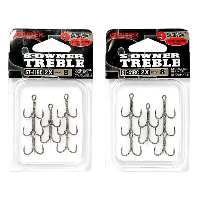 ST-41 TREBLES, 2X strong with a corrosion-resistant black chrome finish, are the ideal replacement hooks for improving the hooking power of heavy freshwater and most varie-ties of saltwater plugs, spoons and die-cast jigs. Lethal when used as a "stinger" for rig-ging natural baits. Features include a short shank, round bends and three slightly curved in Cutting Points.