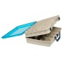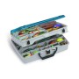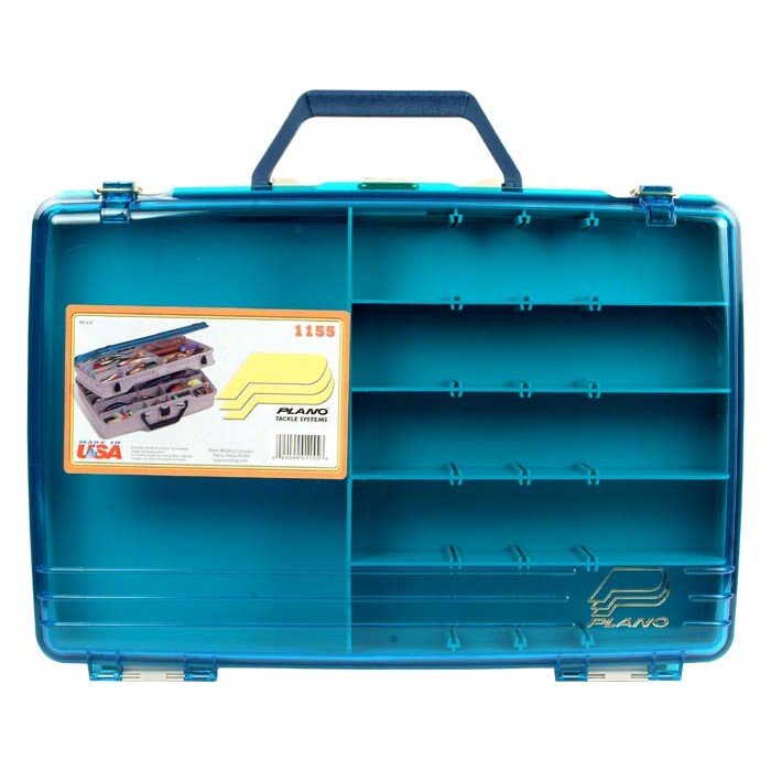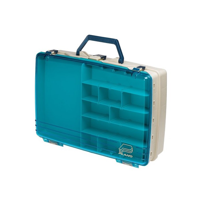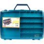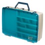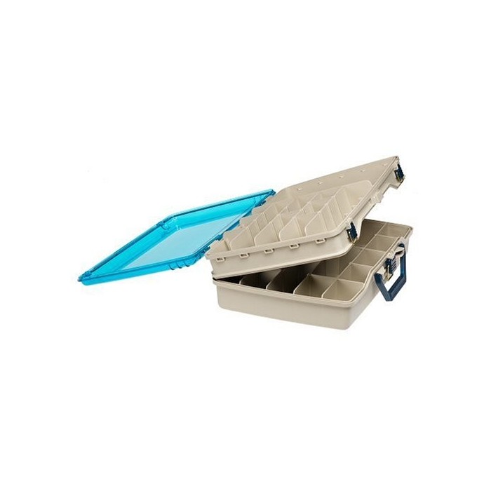 This hard system speciality box is a double cover organizer in a deep blue and beige. It is very attractive, and is quite large with two layers of storage with up up to 46 adjustable compartments forstoring your lures, weights,bobbers, and etc. There is a larger area in the top cover that is approximately 10" x 7" x 2" that is perfect for your bigger items.