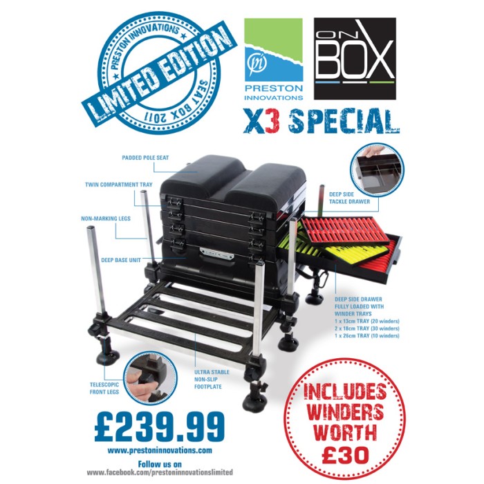 Preston 2011 Limited Edition X3 Special Seat Box. This truly exceptional value seat box comes complete with a padded pole seat, twin compartment tray, non marking legs, deep base and much much more!