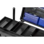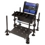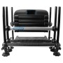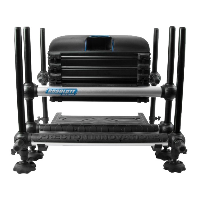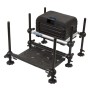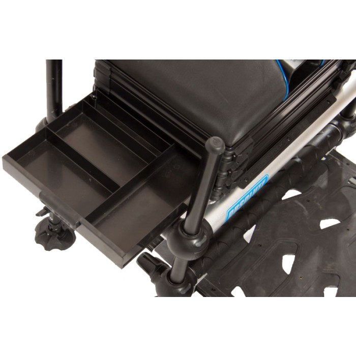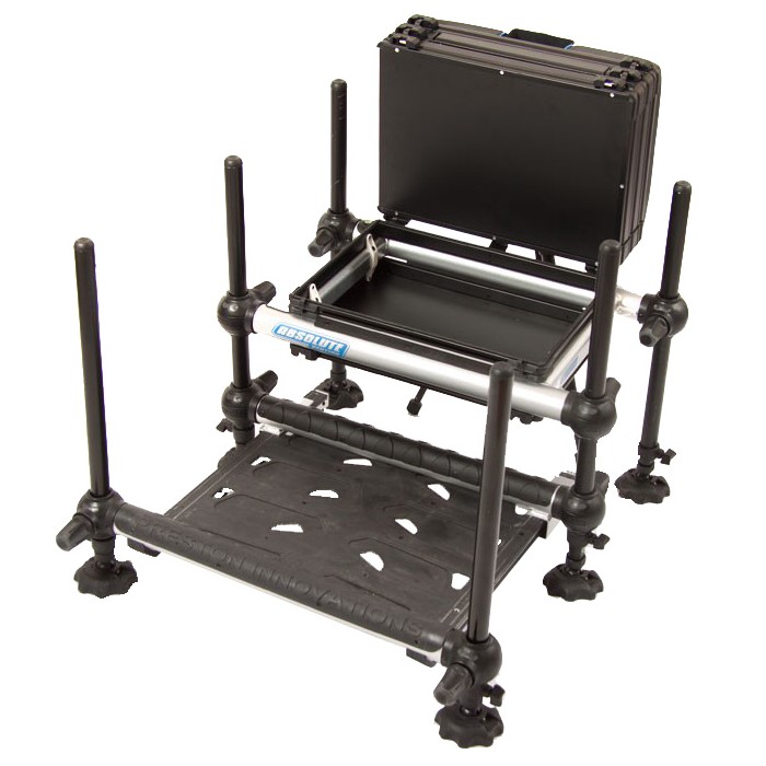 Deep Frame Mounted Base, removable, covered footplate, integral spirit level, anti-snag hand wheels, shuttle adaptors, 30mm Telescopic legs, under seat storage for 3 hooklength boxes, adaptable modular storage solution.