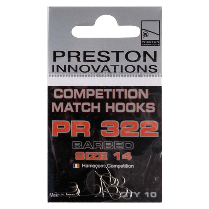 Prestons PR hooks are established as one of the leading brands of match hooks and cover everything from bloodworm to match carp fishing. All PR hooks are made from 110-carbon steel with chemically sharpened points. New for this year is a range of barbed Competition Hooks. These are top quality hooks made using 110-carbon steel and chemically sharpened points.