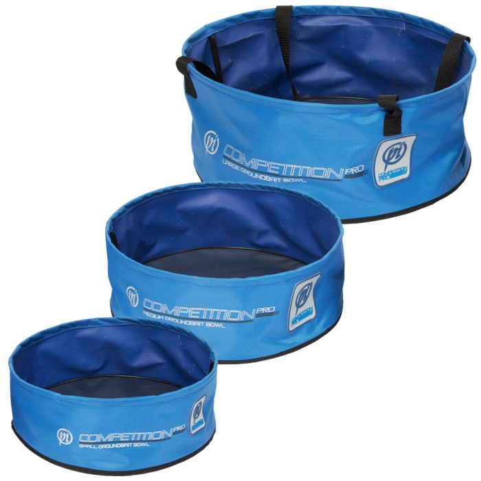 Three NEW bowls in the Competition Pro range. Hard wearing wipe clean bait bowls suitable for mixing and storing groundbait. Collapsible for easy storage and transportation and featuring a stiff top ring to ensure rigidity whilst in use. Ideal for both commercial and natural venues. Small capacity: 5 litres. Medium capacity: 10 litres. Large capacity: 20 litres.