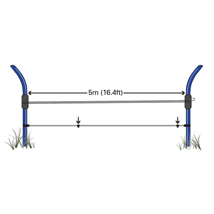 Complete with a 5m (16.4ft) cord for setting out accurately, there are 2 colour coded toggle stops to enable you to mark different distances with the same set of sticks. To use, stick them in the ground at the set distance and wrap the required number of wraps around the sticks, if the distance you need to mark is less than a full wrap use the coloured markers to mark up to two ranges.