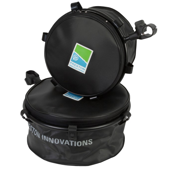 A waterproof EVA groundbait bowl with a rigid hoop, for attaching to a seatbox or platform legs. Collapsible for easy storage and transportation.