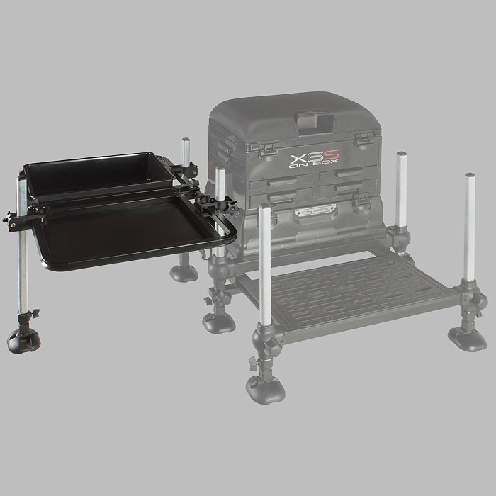 The tray features an adjuster or adaptor so it can fit most seat boxes as the tray attaches to two-seat box legs. It comes complete with an additional support leg for stability that is also handy for attaching accessories to the outside edge of the tray. Great for when loading on heavier tools and bait to the tray as the last thing you want is a wobble and you lose all the bait you just made!