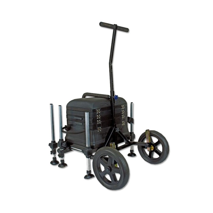 The OnBox Trolley can be fitted to any OnBox seatbox in seconds, without the legs of the box being removed. Once in use the weight of the box is balanced over the two puncture proof moulded EVA tyres to make transporting easy.