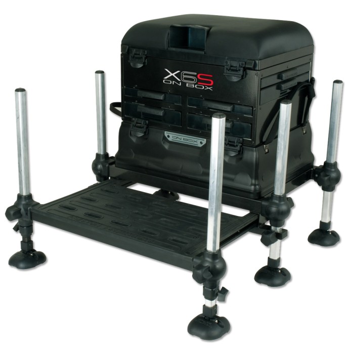 - The X6S seatbox has been developed with larger profile legs to make it more stable.These feature non marking knuckles and increased sized swivel mud feet. The new cassette style footplate slides neatly underneath the box for easy carrage and has a full non-slip cover.