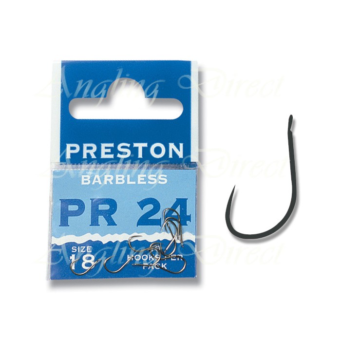The Preston Innovations PR24 hooks are available in various sizes and are a barbless hook with an inturn point and bronze finish. Part of the PR range which are manufactured from carbon 110 steel.