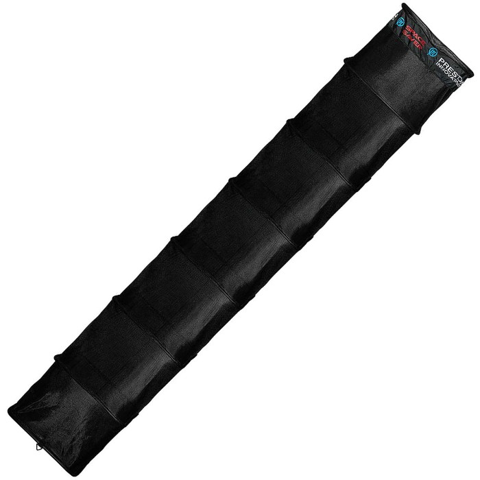With anglers catching more and more fish on commercial fisheries these days carrying and using extra keepnets has caused various headaches. Not any more! With its innovative reversed top ring you can now locate up to five Space Saver Keepnets in front of your seatbox when used in conjunction with an OffBox Pro Snap-Lok Pro Tool Bar and this unique orientation also facilitates the easy transfer of fish from landing net to keepnet. The 2.5m compact design also enables the easy storage and transportation of multiple nets. Reinforced bottom rings. Black carp mesh. Length 2.5m. Fix Angle locking system.