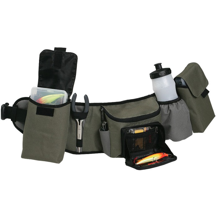 This is what the ultimate hip pack is built with: Lure tray and built-in workstation connected to the zippered main compartment, two removable holsters with 3450 size tackle boxes included, custom retractor pocket for line clipper, elastic strap plier holder, and padded bottle pocket, and adjustable fit with durable side release buckle and 600D nylon as main material.