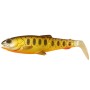 Crafted and designed by legendary designer Mads Grosell. The lure profile is inspired by a baby trout smolt, with the classic Cannibal open mouth, a realistic big soft eye and a new unique tail bridge design, that enables the lure to swim amazingly life-like even at very slow speed. The lure swims equally well on retrieve and as on the drop and the tooling making and handcrafted details and painting set new standards for soft lure making! This paddle tail loose body lure will catch just about any predator fish out there!