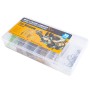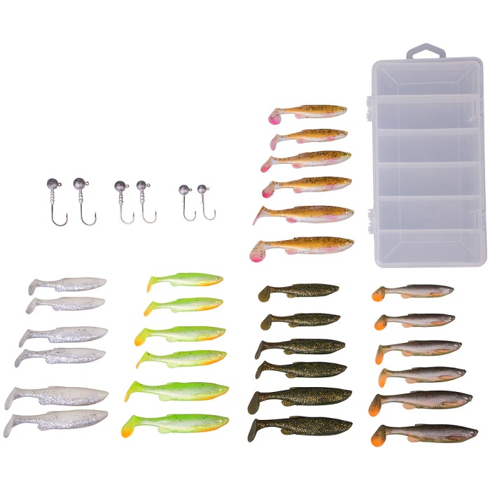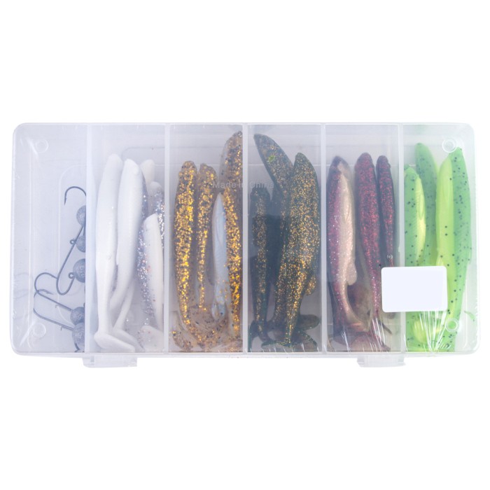 The Fat Minnow T-Tail Kit delivers a host of superb Fat Minnow paddle tail shads with a set of jig heads to get you out using these deadly lures as quick as possible. The kit consists of 30 lures (2 lures of each size per colour, 3 sizes, 5 colours) plus 6 jig heads (2 jigs of each size, 3 sizes). Fantastic for a wide range of methods form retrieving to vertical fishing for a range of species including Perch, Pike and Zander. The kit components come prepacked in a reliable 6 compartment Savage Gear bits box.