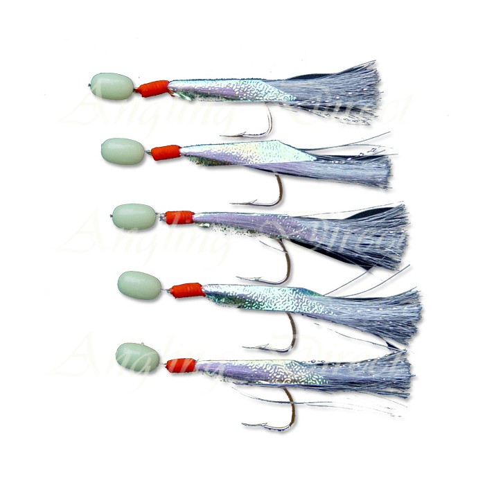 Shakespeare Harry Flasher Rig, Five lurex and white strand bodies, Luminous bead head and glitter tail, Ideal for mid depth and deeper species and Size 3/0 hooks to 50lb mono.