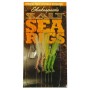 Five assorted coloured and feathered silver strip fish lures with assorted coloured latex fish shape bodies with eyes.