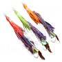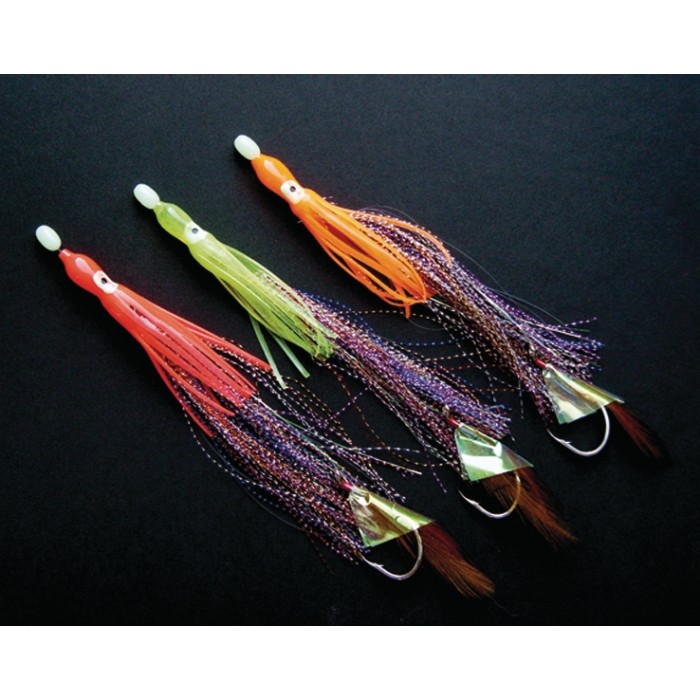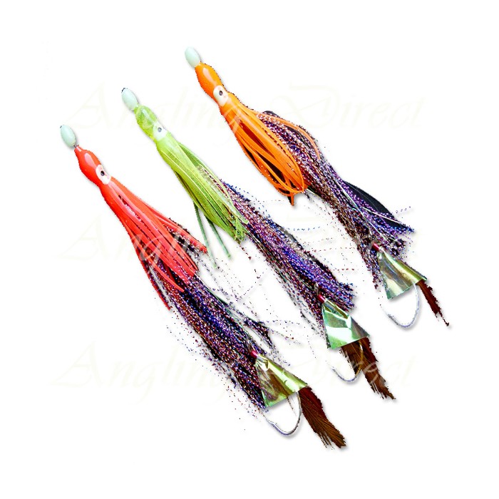 Three multi coloured squid feathered rig with sparkle and iridescent wrap to attract most deep large predatory fish.