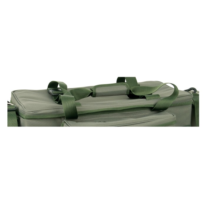 The Deluxe Carryall can hold up to five large or 10 small Olive Accessory Cases, as well as an additional two small cases in the spacious side pockets. The cases can be arranged in a number of configurations, as two of the small accessory cases are equal in dimensions to one of the large. Using this 2:1 formula you have many fantastic configuration opportunities to create your dream tackle box system. With two top webbing straps this Deluxe Carryall can also accommodate your bivvy table (again in the Olive Carp Luggage range) as well as your Olive Buzzer Bar Bag – plus any additional other items you might need. The front pocket of the bag is capable of housing a standard sized plastic tackle box (please check product for full specifications before purchase).