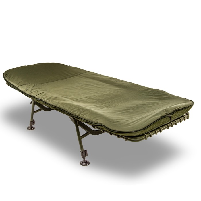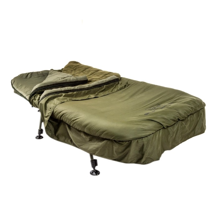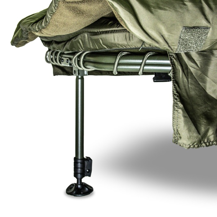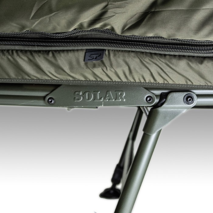 The sleeping bag that is integrated into this Solar sleep system offers 5 season comfort with a super soft peach skin outer material. This sleeping bag is also dual layer, so you can make this sleep system comfortable in all seasons, from -10 to hot summer days. The baffle on this sleeping bag is also oversized to allow you full comfort and prevent the insulation fill from moving around inside the sleeping bag. Also, so you can easily get in an out of this sleeping bag when you get a screaming take on your bite alarms, this sleeping bag on this sleep system uses easy slide anti-snag zips.
