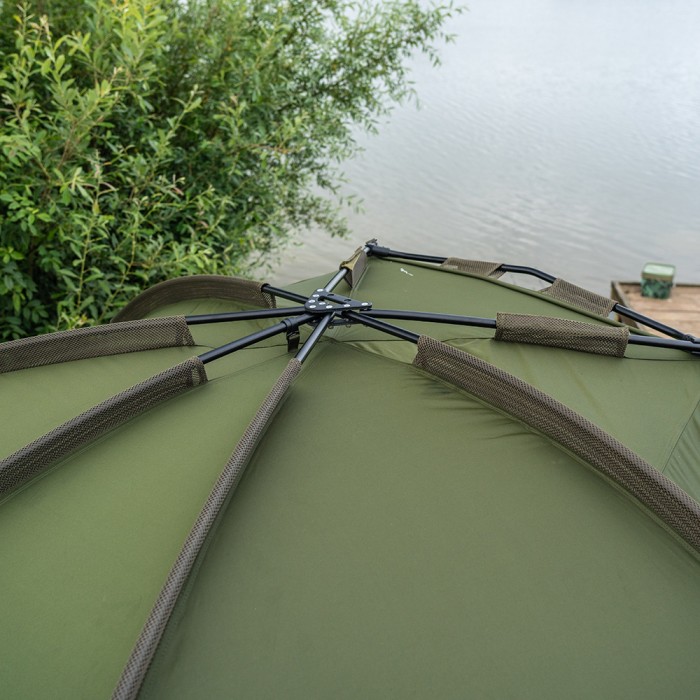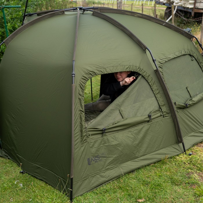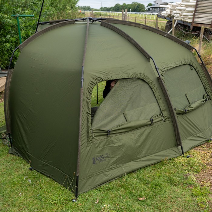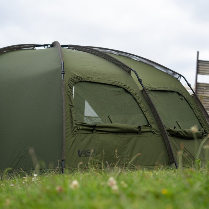 Following on from the success of the highly acclaimed AXS Bivvy the AXS-V2 Bivvy is built around the super strong AXS ALLOY central hub and lightweight anti-twist 6061aluminium frame, that provides an ultra-quick and super stable setup. The canopy has been upgraded to our new 16,000mm HH Cloudbase+ fabric which is tough, light and extremely waterproof. The frame is shaped with a high flat back and steep sides to offer maximum internal space, ideal for those longer sessions in the UK or Europe. The oversized front peak with rain drip guard offers even more protection and is a perfect size to cover your levelbed and kit from the elements. A big bonus for those trips abroad is the addition of the clip in or zip in heady-duty groundsheet that also features a fold back door entry flap, helping you to easily keep the entrance area dry and clean. The bivvy also features a zip on/off front panel complete with mozzi side windows and fully customisable front door system. Other benefits include, front and rear internal pockets and green/clear door panel options, plus three-way vents on the rear that can be opened from the inside of the bivvy. Integral Watershed vent spacer bars, an oversized compression style bag, two 48 quick connect storm poles and heavy-duty T-pegs complete the package. *AXS-V2 Vapour Cap and AXS-V2 Wrap available separately.