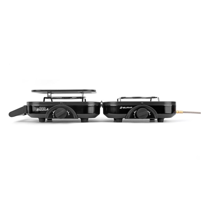 The Sizzla 2Burna is a perfectly portable two-burner camping stove, ideal for bankside cooking. It features independent dial controls, push-button ignition, and a quick setup designsimply fold out and connect your gas canister.