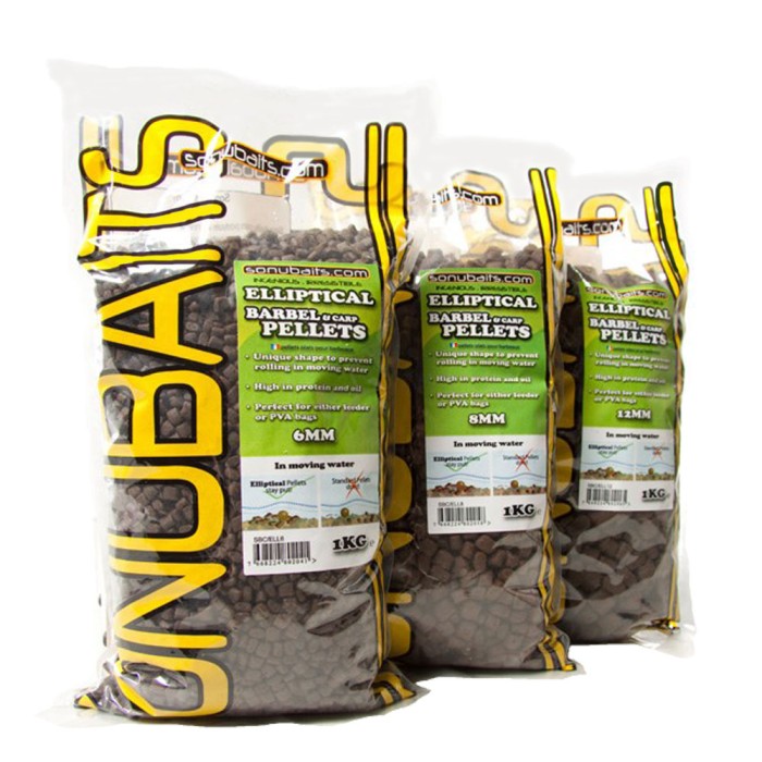 Barbel & Carp Elliptical Feed Pellets are available in 4mm, 6mm, 8mm and 12mm sizes and supplied in 1kg Bags.