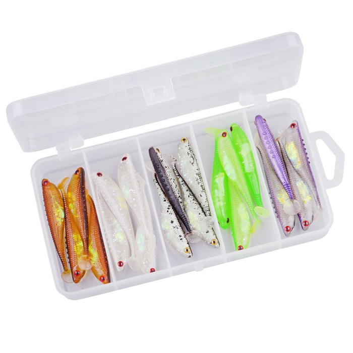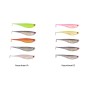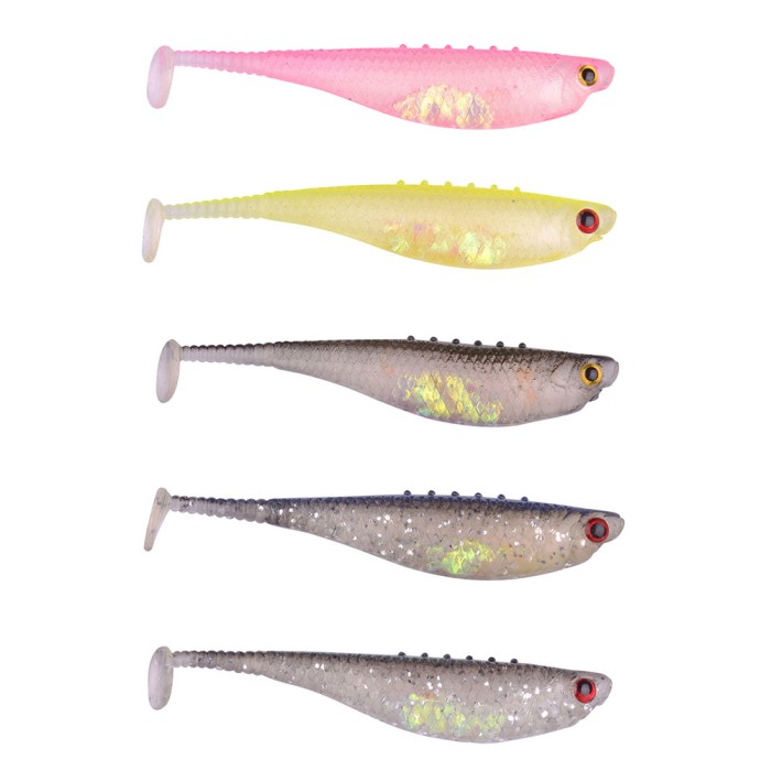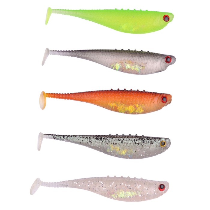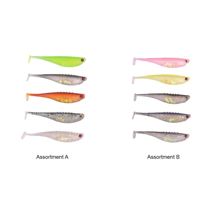 Assortment of high quality softbaits in various color designs with aurora film inside the belly for life like effects underwater.