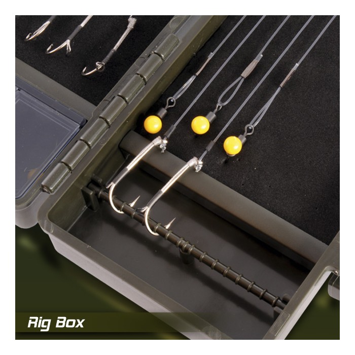 One of the most unique features of this rig box is the profiled hook bars. This help to stop your rigs from sliding around inside and will consequently keep them secure and in place. Your hook links and hooks themselves are vital parts of your set up and it is essential that they are looked after properly. If you tie your rigs they can be easily stored by attaching the hook to the bar and kept straight and neat by pinning the other end down with one of the rig pins. No longer will your rigs become scratched up or damaged from sitting loosely in a box, now they will stay firmly in place and your rigs will stay on top form for longer than ever before. There is plenty of space to store more than 50 rigs so you can keep your entire collection of rigs in this box and not have to worry about any damage or wear.