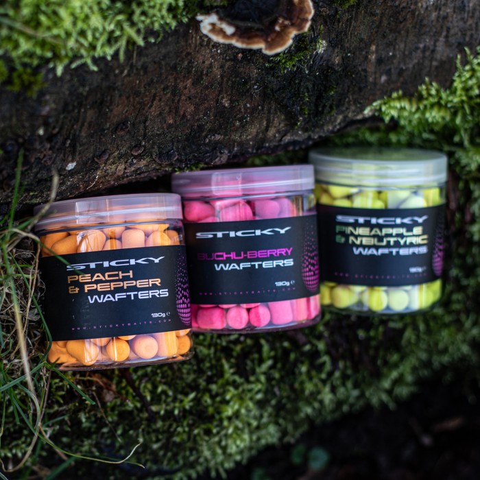 Coming in 4 colour and flavour options, the Sticky Bait wafters ensure high bait attraction to your target fish's preference. The Peach & Pepper flavouring comes as bright orange hookbaits that feature a genuine old-school classic combination of Peach Melba and 100% pure black pepper essential oil. The second option; Buchu-Berry flavouring are bright pink hookbaits that include a special combination of attractors. The third flavour in the range is Pineapple & N'Butyric which are bright yellow hookbaits that are infused with two of carp anglings most proven additives. Finally, the fourth flavour in the range is White chocolate which are the platinum white hookbaits that are the ultra-consistent performer from the range with their divine chocolate and cream aroma, and sweet taste.