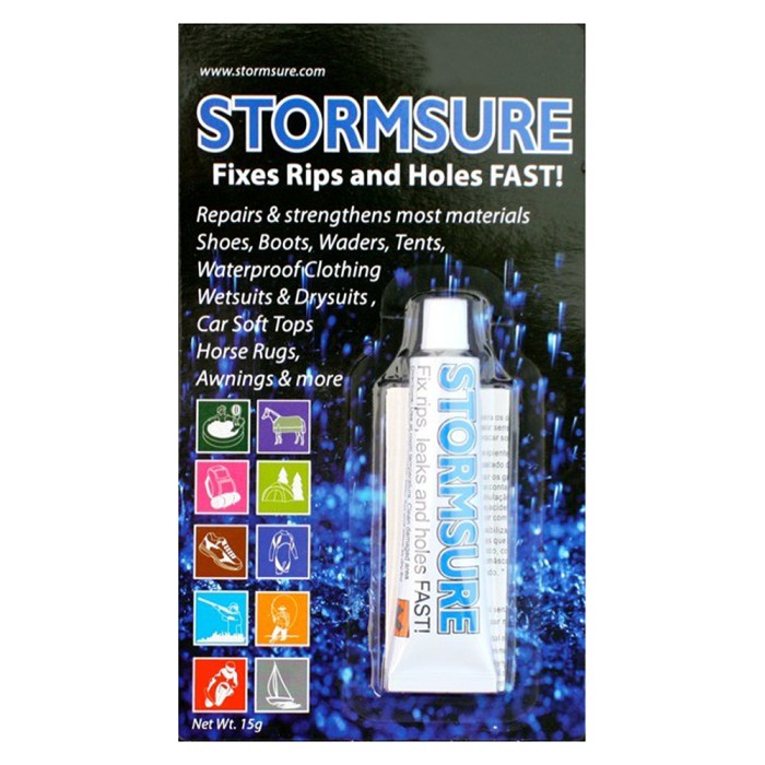 A 15g (1/2 oz) tube on a card with full instructions. Stormsure Flexible Repair Adhesive will stick virtually anything. It is excellent for repairing anything that needs to be waterproof or airtight. It is highly abrasion resistant, and will glue together almost any two surfaces! It is slow curing, so there is never a rush to get it right. But once cured it is very difficult to break it apart. Stormsure is flexible when cured and ideal for fixing leaks and rips in leather, rubber and most man made or naatural fabrics. So you can repair your rubber boots, convertible hood, airbed, tent, furniture, ceramic flower pots, horse blankets...the list goes on and on!!