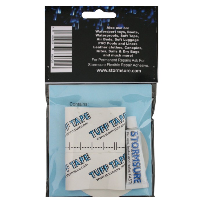 A repair kit for use on rips and split seams in inflatable canoes. The Stormsure adhesive and TUFF patches can fix many typical problems on PVC fabric quickly and easily. Punctured inflatable tubes can be repaired in a few seconds and pumped up again for use immediately. The Strip of TUFF tape will cover large and long cuts or splits. Areas which suffer form high levels of abrasion can be reinforced vey effectively.