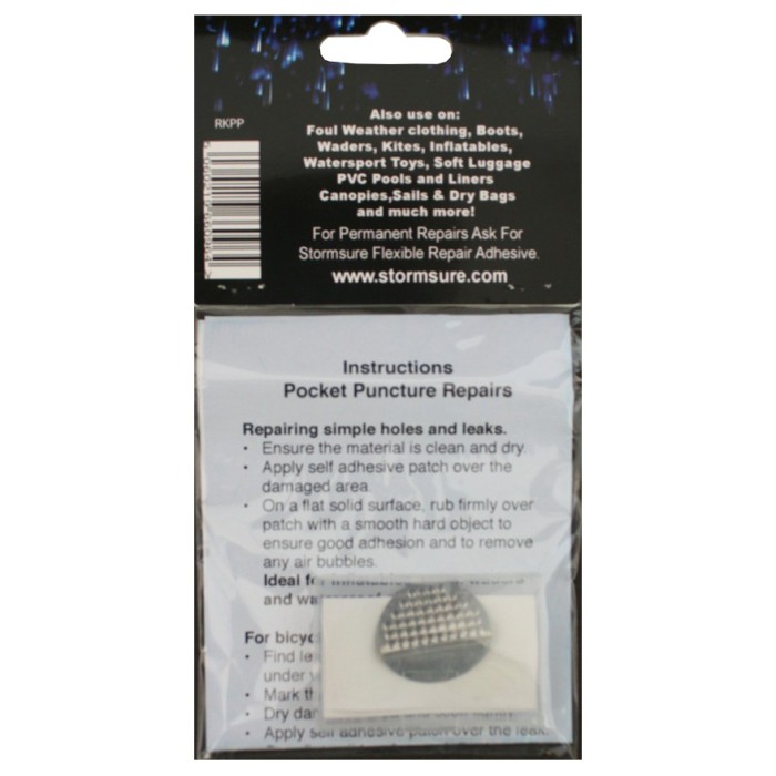 Small pack of 12 circular self adhesive patches. Apply over pin hole leaks on cycle tyre tubes, waterproof clothing, inflatable toys etc. They work very well on smooth surfaces. For awkward shapes, lumpy seams and rough surfaces, use Stormsure Flexible Repair Adhesive.
