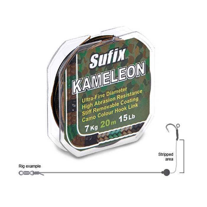 This versatile link offers a stiff strippable outer skin with outstanding camouflage properties. Produces a wide variety of advanced rig presentations. A neutral buoyancy Dyneema braid is treated with a tangle-free removable outer skin. So supple that running your fingers over Kameleon will allow it to straighten. Features high knot strength and unrivalled abrasion resistance.