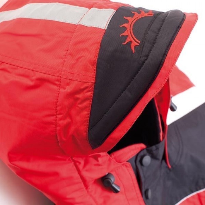 Jacket : Polyester body lining, Polar fleece lined collar, neoprene cuffs, reinforced elbows, 2 outer pockets, two inner pockets, Polar fleece hand warmers, 2 way YKK main zipper, adjustable waist cord and adjustable hood.