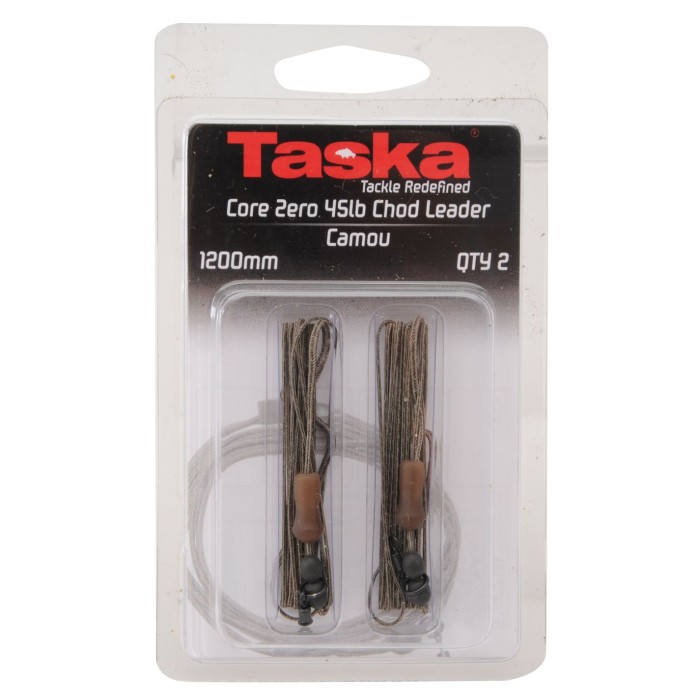 The Taska core zero ready tied chod leaders come In camo and are 1200 mm in length with every one using chod rigs now days the need to have the spliced leader done right is the most important part , so we have taken that stress away from you with our own core zero ready tied cod leaders , the chod rig is ideal for fishing over weed and very silty lake beds , this type of rig is ideal for the angler that turns up at the lake and sees fish jumping all he has to do is cast a chod rig out and he is fishing , the chod leader is easy to attach to the mainline , all you have to do is tie a loop in your mainline then pass the mainline loop through the spliced loop on the leader then pass the core zero through the loop in the mainline then wet both loops and pull tight.