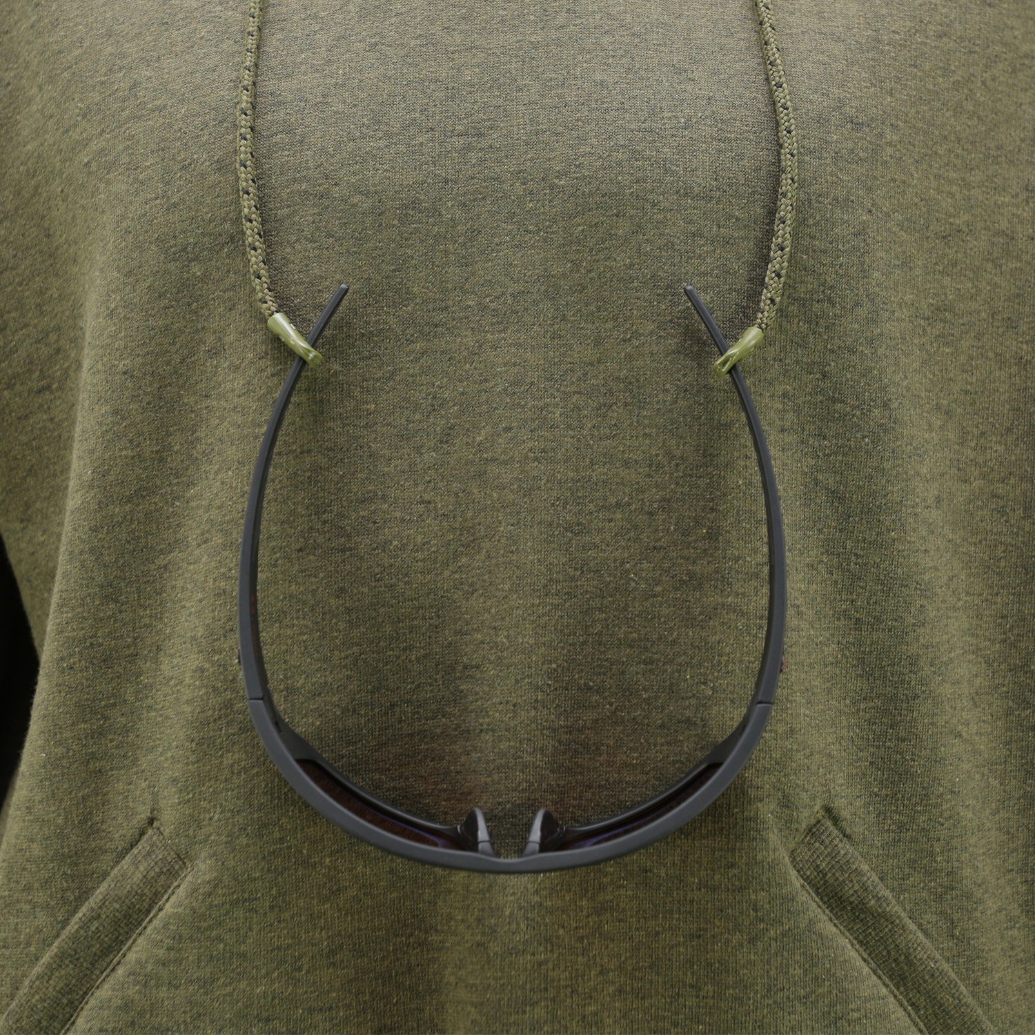 Trakker has taken the usual camo green fishing hoody by adding a unique lanyard drawstring around the neck. This drawstring has clips of the end that are designed for retaining sunglasses. The clips simply hook onto the arms of the Trakker sunglasses and you will never be wondering where you left your eye protection. The lanyard means whenever the sun begins to show you can quickly whip the glasses on and inspect the fish in the nearby waters without the horrible glare.